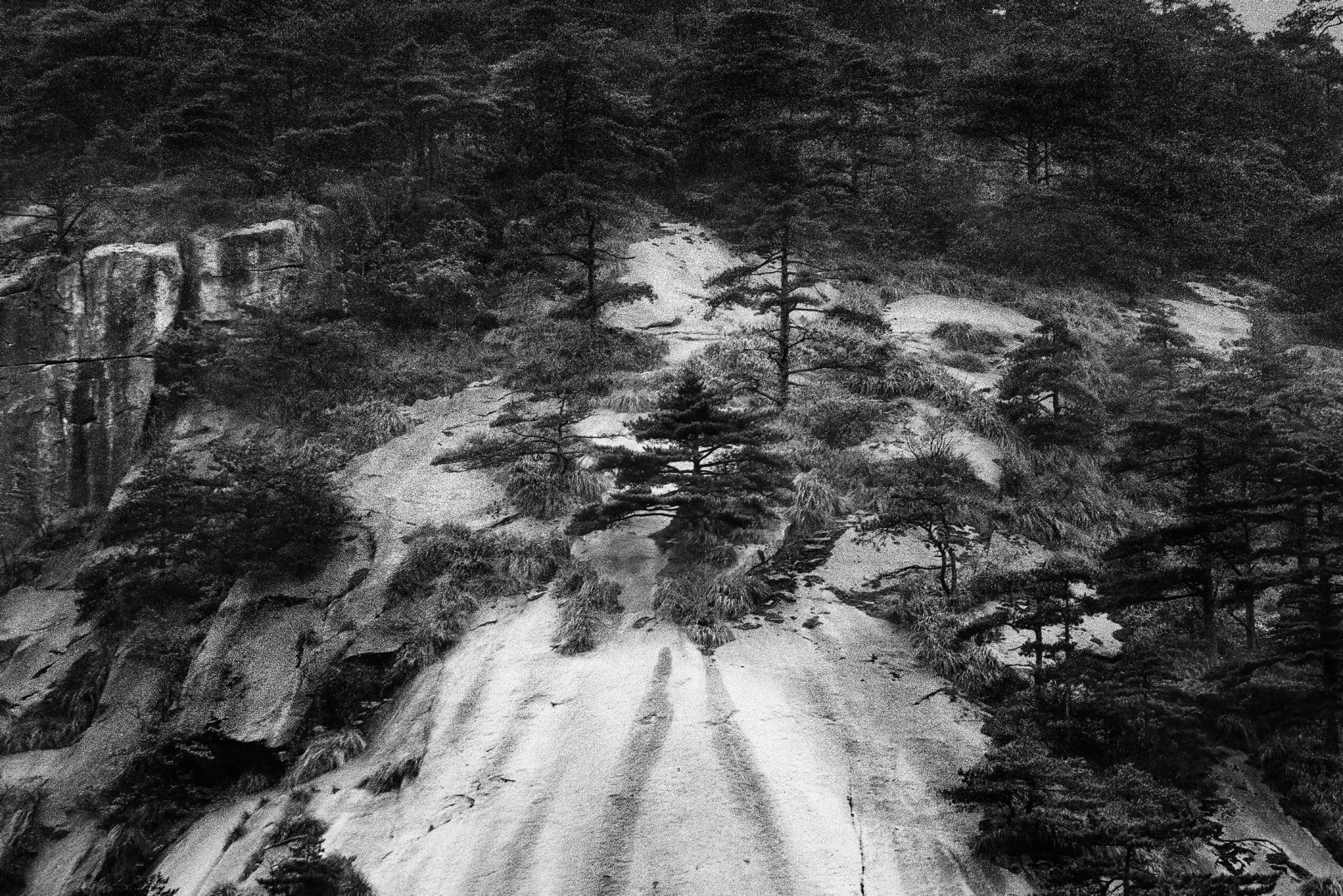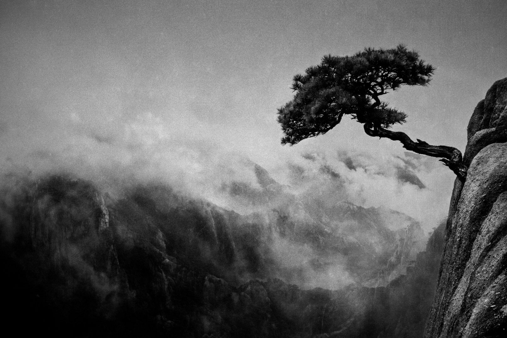 Cette errance s’est notamment poursuivie en Chine, au sein des Monts Jaune. Le lieu s’avère d’une beauté stupéfiante : les conifères tourmentés croissent et s’insinuent sur les blocs de granite ; le soleil y perce peu. Le lieu est également chargé d’une symbolique particulière puisque, 2600 ans avant J.C., Huangdi, l’Empereur Jaune, y serait venu chercher un élixir d’immortalité. Le pic du Lotus, qui a directement inspiré le titre de Loto Nero, constitue le point culminant du massif, à près de deux mille mètres d’altitude. Depuis l’ancienne Egypte, le lotus est associé à la renaissance, laissant tomber ses pétales la nuit pour, au matin, s’entrouvrir à la lumière naissante avec une « nouvelle couronne ». A l’évidence, cette dualité propre à la fleur de lotus caractérise Loto Nero. Mais le noir dispose aussi d’une signification propre : sa densité suggère la présence de la mélancolie. Le noir charbonneux (réceptacle d’énergies, matière absorbante) illustre cet état transitoire d’angoisse qui va et qui vient, dont les nuances rongent progressivement le décor ; elles s’insinuent dans l’image et fissurent l’unité même de la nature : les arbres et les rochers sont asphyxiés par ce lichen. Il arrive toutefois que le pouvoir dévorateur du noir se transforme en une force créatrice : c’est dans la pénombre que se matérialisent les détails et se crée la dynamique des formes propres de Loto Nero.